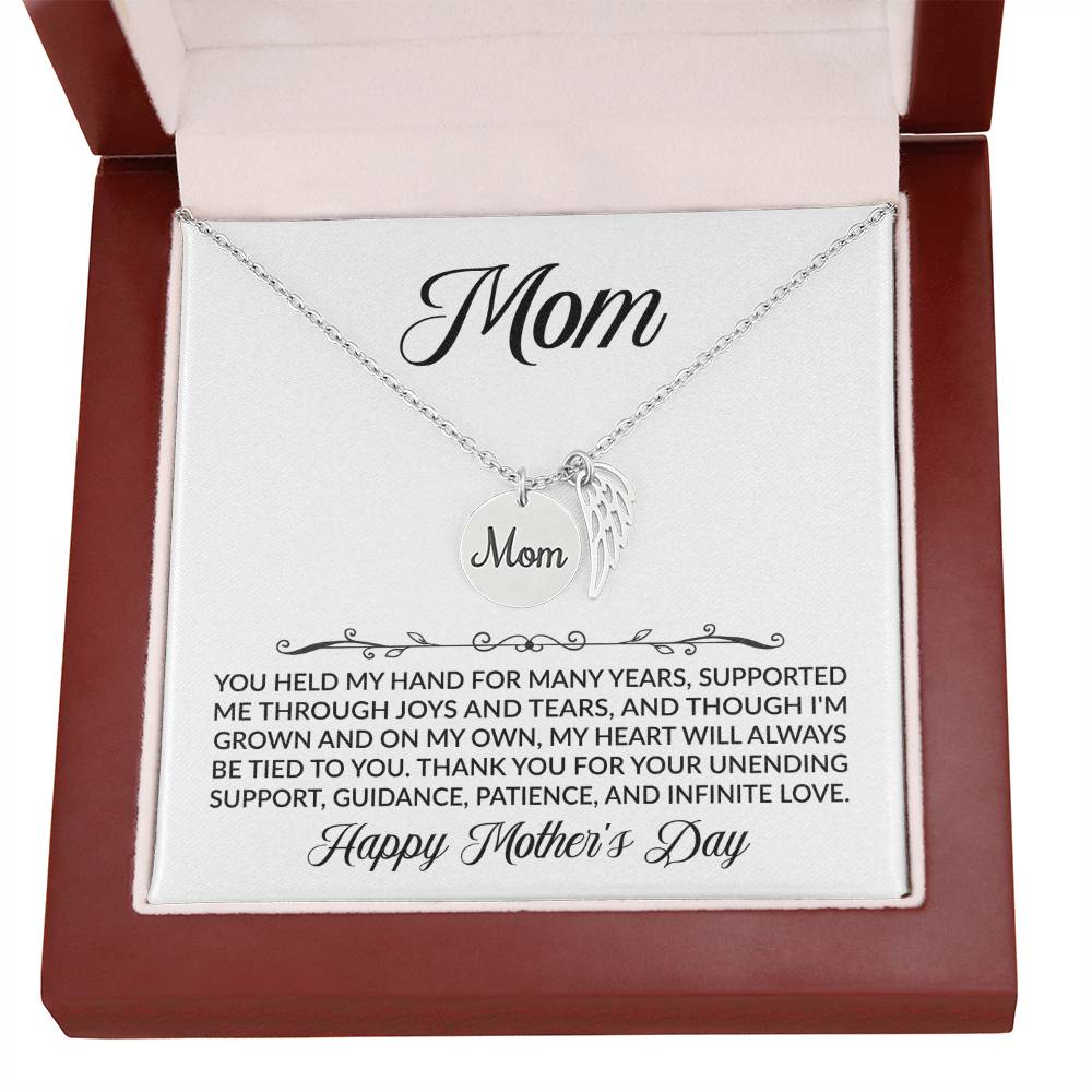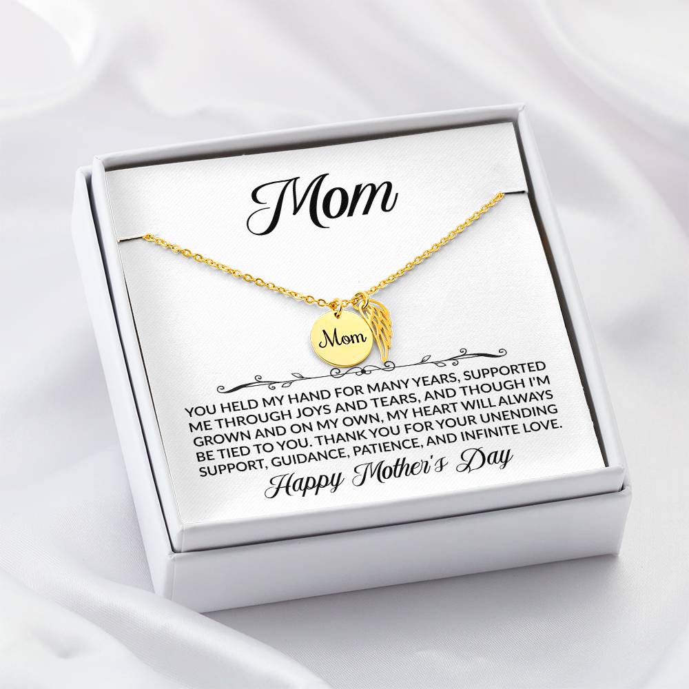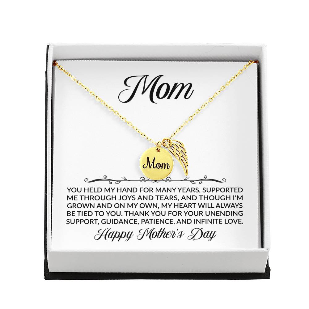 Carry your cherished memories of Mom with you always, thanks to our heartfelt Memorial Necklace. The word "Mom" is elegantly engraved on a delicately hand-polished coin, accented with black enamel for a striking contrast. This coin is beautifully paired with a delicate, polished Angel Wing tag, creating a meaningful and stylish accessory that keeps Mom's spirit close to your heart.