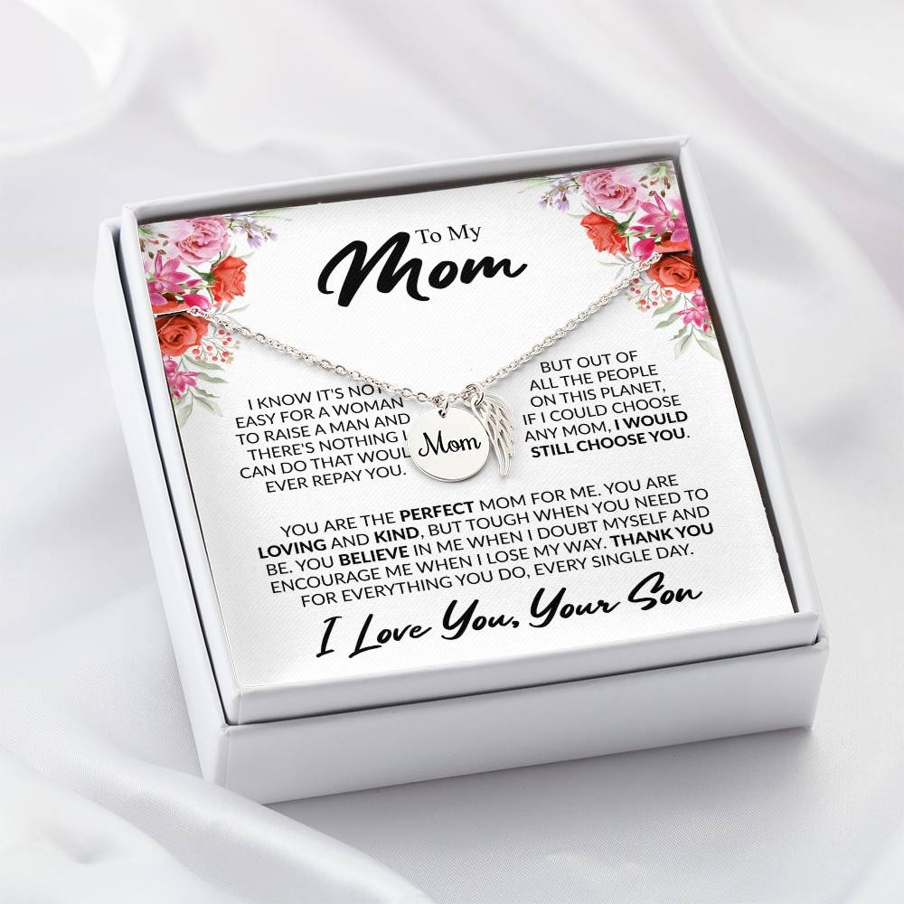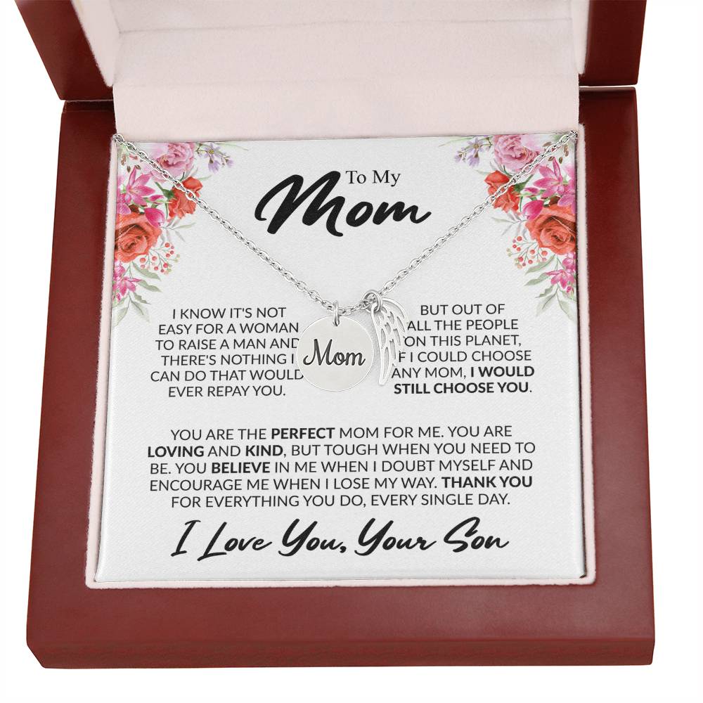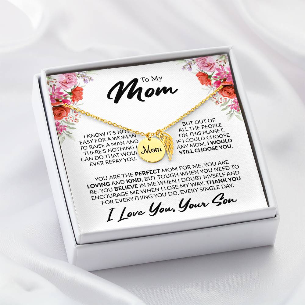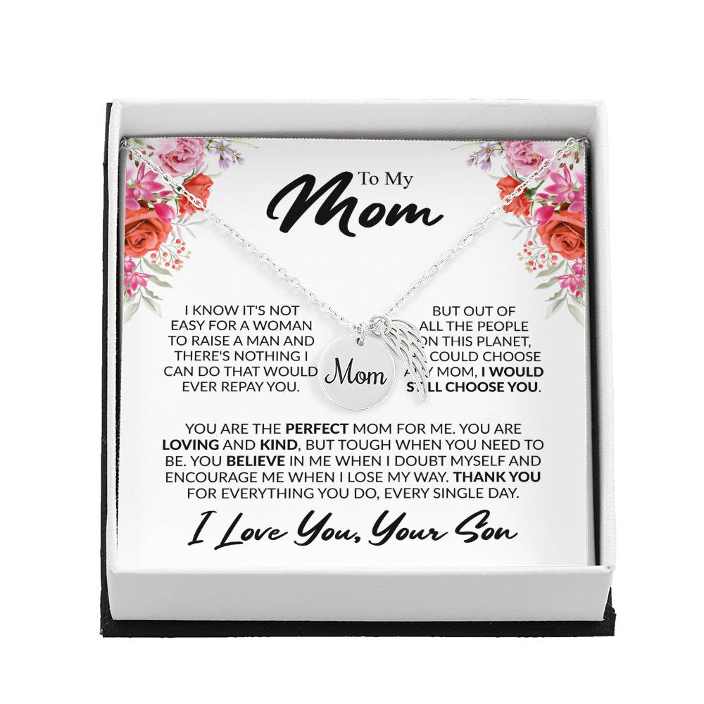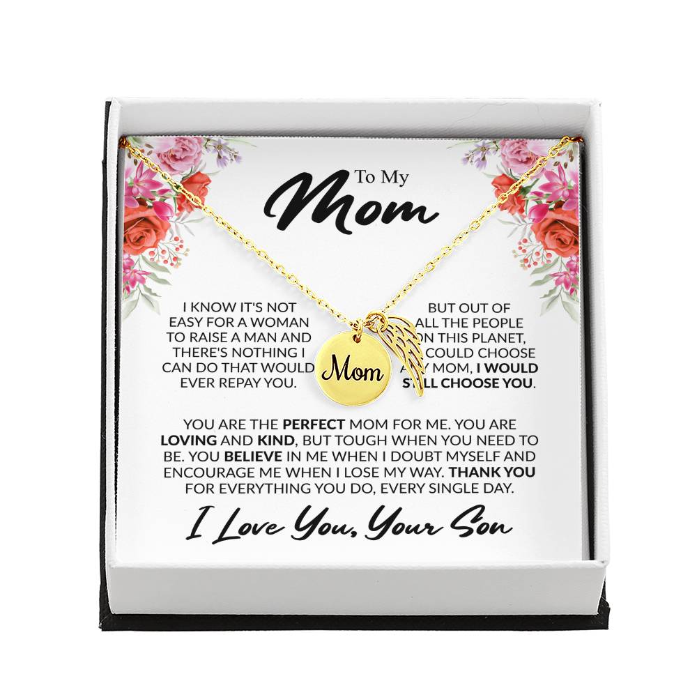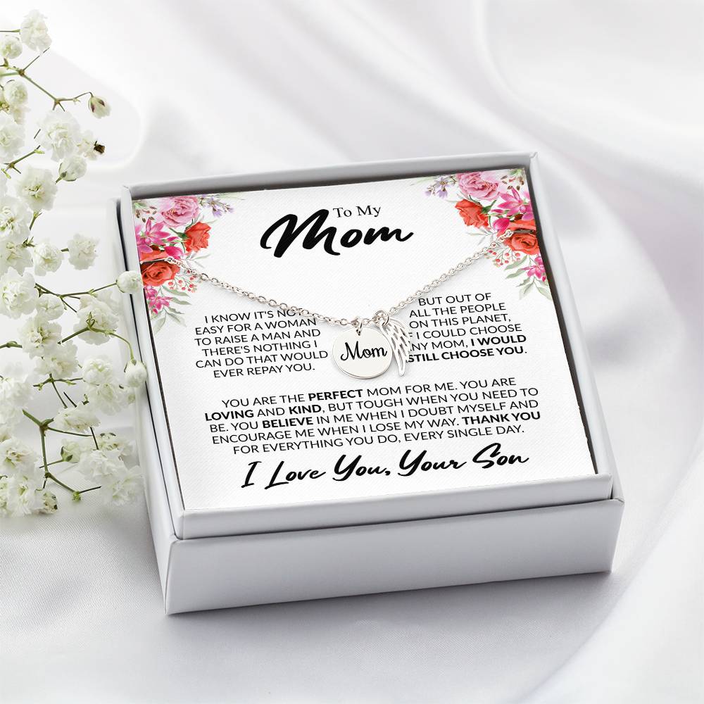 Carry your cherished memories of Mom with you always, thanks to our heartfelt Memorial Necklace. The word "Mom" is elegantly engraved on a delicately hand-polished coin, accented with black enamel for a striking contrast. This coin is beautifully paired with a delicate, polished Angel Wing tag, creating a meaningful and stylish accessory that keeps Mom's spirit close to your heart.